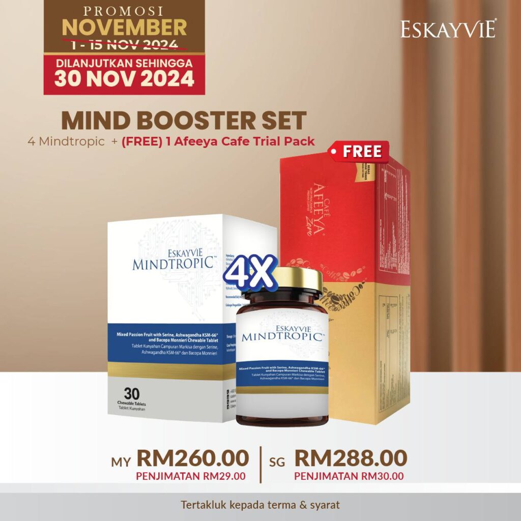 Nak lebih berbaloi? Segera dapatkan PROMOSI NOVEMBER ini! MIND BOOSTER SET ini didatangkan khas untuk anda: 4x Mindtropic